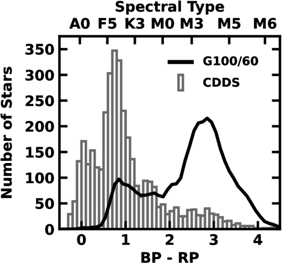 Frequency of BP − RP colors (lower x-axis labels) and main-sequence spectral types (upper x-axis labels; M. J. Pecaut & E. E. Mamajek 2013) of stars in the CDDS sample (histogram) and main-sequence stars in the Gaia 100 pc sample (solid line; Gaia Collaboration et al. 2021b). The frequency of Gaia stars has been normalized by a factor of 1/60. Relative to the Gaia sample of MS stars within 100 pc, the CDDS sample has many more AFGK stars and many fewer M-type and later stars.