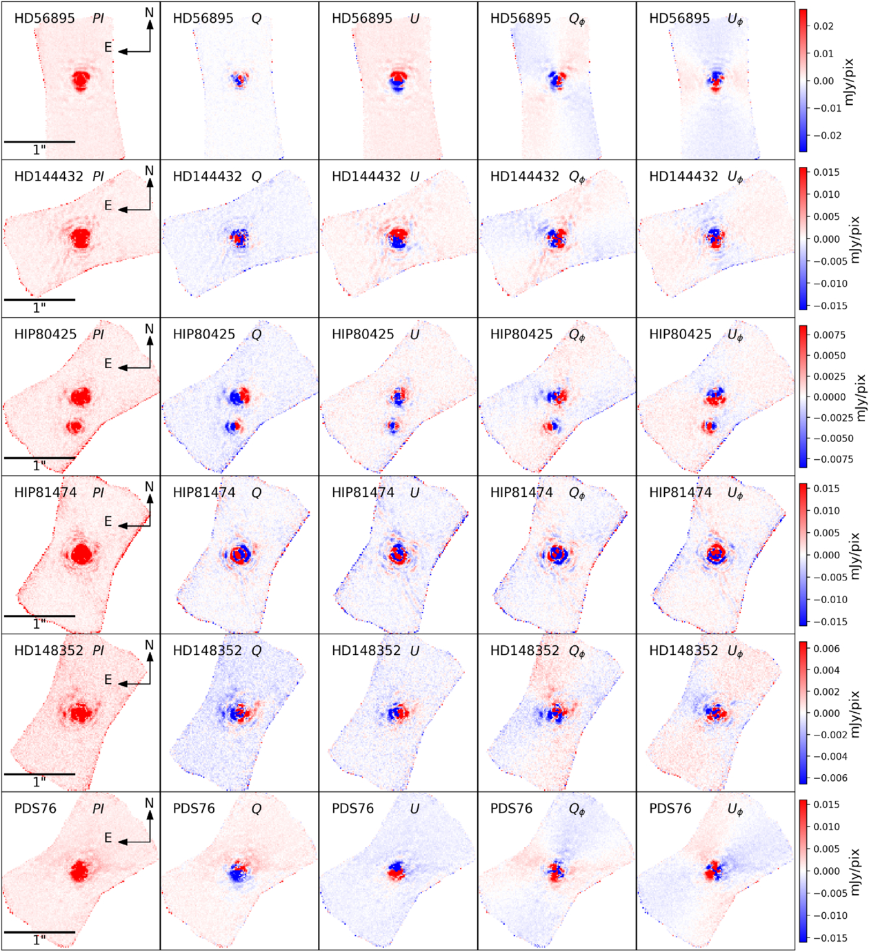CHARIS PDI results showing PI, Q, U and azimuthal stokes for the six new targets. The color bar is set such that red is positive and blue is negative. (The Pi, Q, and U data are available in the online version.)