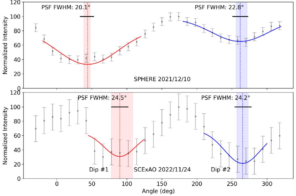 Azimuthal brightness profiles measured at a deprojected radius of 0﹩\mathop{.}\limits^{^{\prime\prime} }﹩19 for two epochs of MWC 480 PDI observations. The y-axis is in the same normalized intensity units as Figure 4. The red curves are a Gaussian fit (Equation (7)) to the brightness dips on the east side of the image (Dip #1), while the blue curves are the Gaussian fit to the west (Dip #2). The PSF FWHM bars represent the angular resolution at the position of the Gaussian fit centers. The dotted lines show the centers of each brightness dip with the shading showing the 1σ errors.