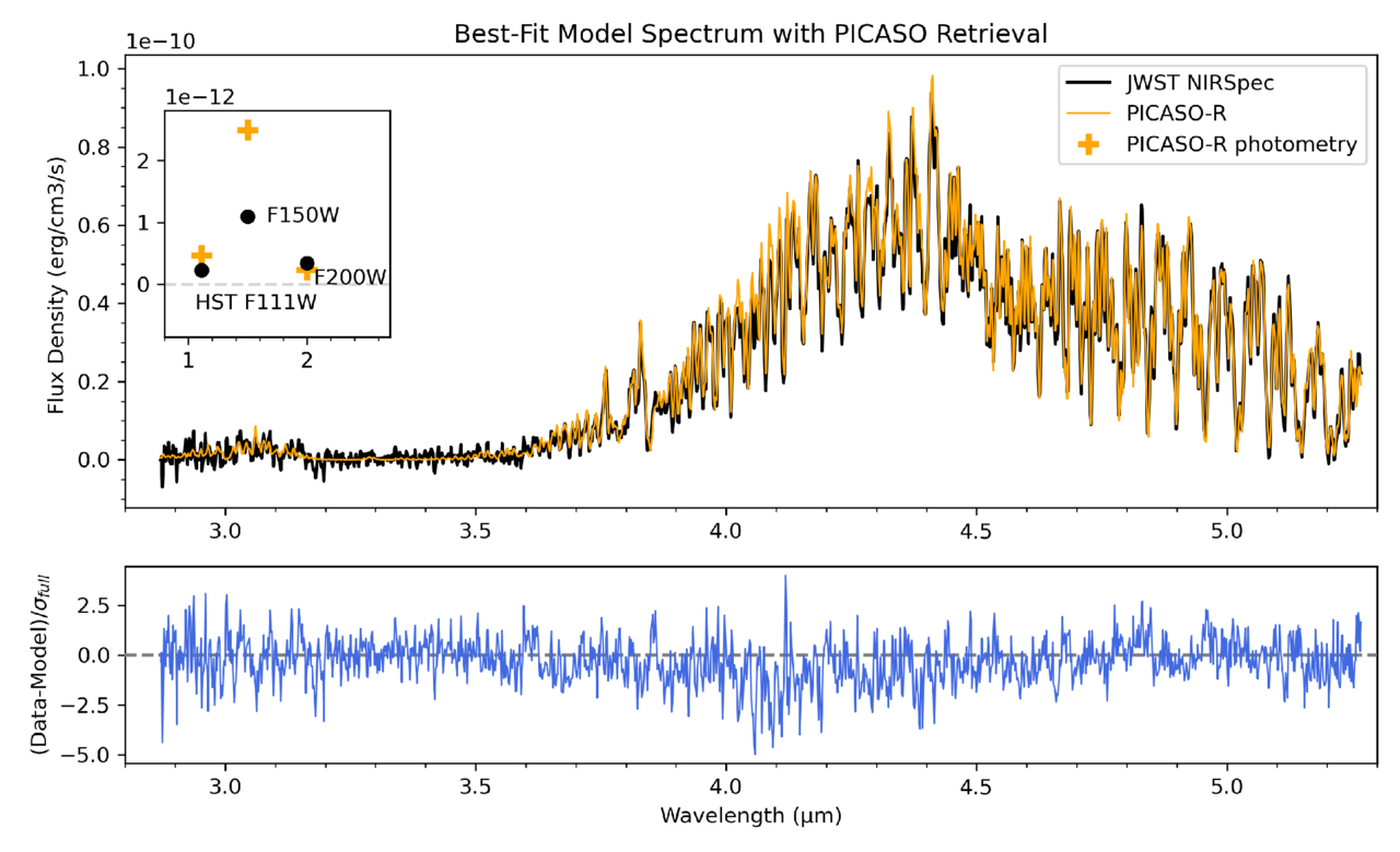 Top panel: the solid black and orange lines show the NIRSpec/G395M spectrum and the best-fit retrieval spectrum, respectively. The inset plot shows the JWST NIRCam F150W2, F200W, and the HST F110W broadband photometry, which are plotted in black dots. The integrated band photometry of the best-fit retrieval spectrum area is plotted with the orange plus signs. Bottom panel: the difference between the NIRSpec spectrum and the best-fit retrieval that is normalized by the full uncertainty (σfull), which includes NIRSpec/G395M data uncertainty and the two the marginalized uncertainty parameters described in Section 3.2.1.