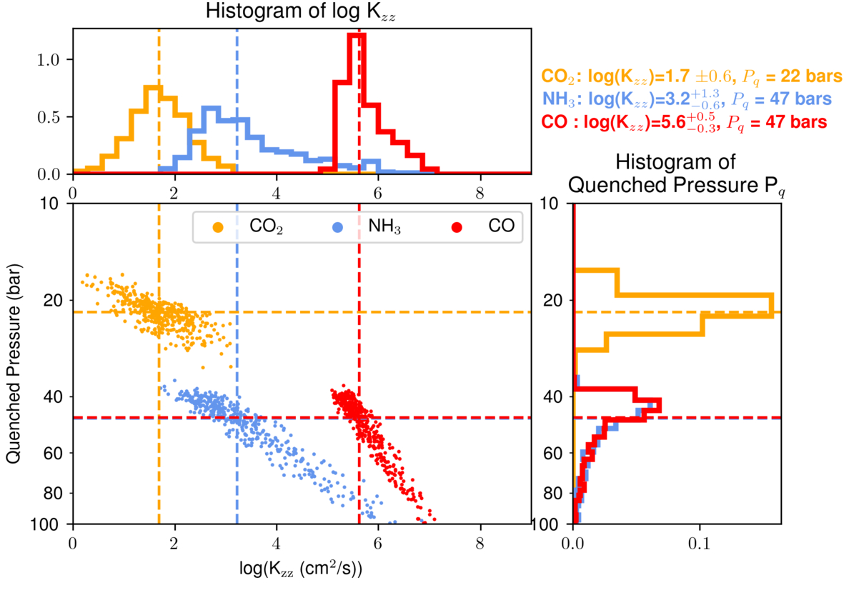 Bottom-left panel: the derived ﹩\mathrm{log}({K}_{zz})﹩ of CO, CH4, and NH3 as a function of quenched pressures based on the temperature–pressure profile and abundances from the 500 posterior samples of the PICASO retrieval. The median values of ﹩\mathrm{log}({K}_{zz})﹩ and quenched pressures of are plotted in colored dashed lines. CO2 has the lowest median Kzz among the three species and has the lowest quenched pressure (22 bar) while ﹩\mathrm{log}({K}_{zz})﹩ of CO is the highest with a median quenched pressure of 47 bar. The derived ﹩\mathrm{log}({K}_{zz})﹩ of the three molecules increase with higher quenched pressures. Top-left and bottom-right panels: the histograms of the derived Kzz and quenched pressures are plotted in the top-left and bottom-right panels, respectively. See the text in Section 3.5.2 for details about the derivation of Kzz.