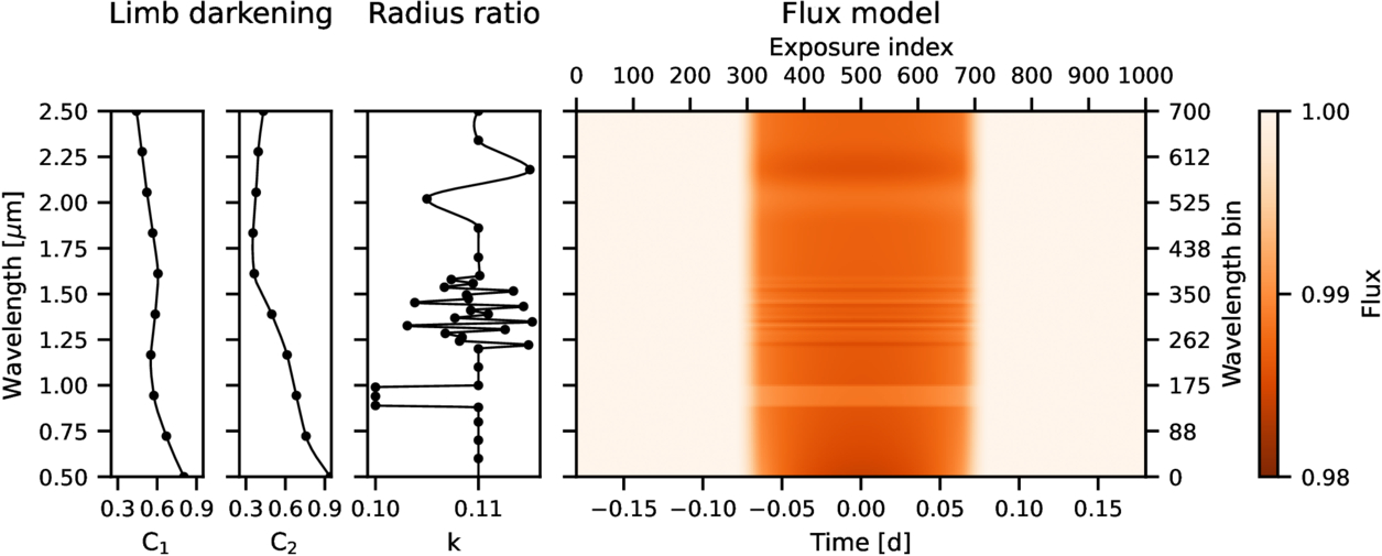 Example of a spectrophotometric transit model. The first two panels show the power-2 limb-darkening coefficients as splines over wavelength with freely placed knots. The third panel shows the planet’s radius ratio modeled in the same way. The rightmost panel displays the model flux as a function of time and wavelength.
