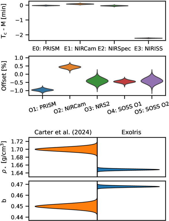 Posterior distributions for a subset of ExoIris model parameters from the WASP-39 b joint analysis. The first panel from the top shows the transit-center time offsets for the four epoch groups, the second panel shows the additive offset posteriors, and the two bottom panels compare the stellar density and impact parameter posteriors to the estimates presented in A. L. Carter et al. (2024).