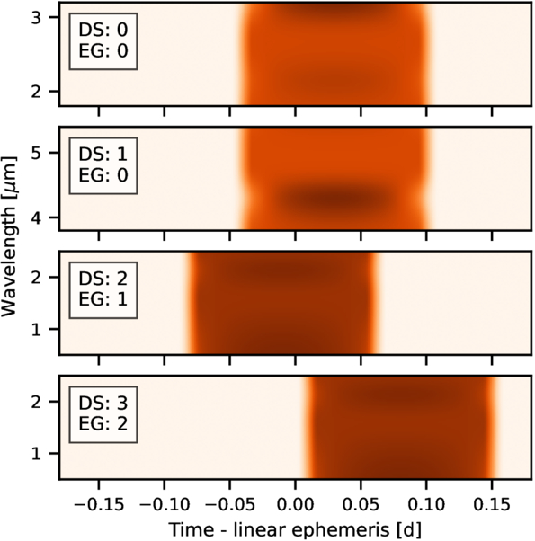 Example illustrating the use of epoch groups (EG) to account for TTVs in a joint transmission spectrum analysis with ExoIris. The example includes four spectrophotometric datasets (DS): two from the same epoch observed with different instruments, and two from separate epochs observed with a third instrument.