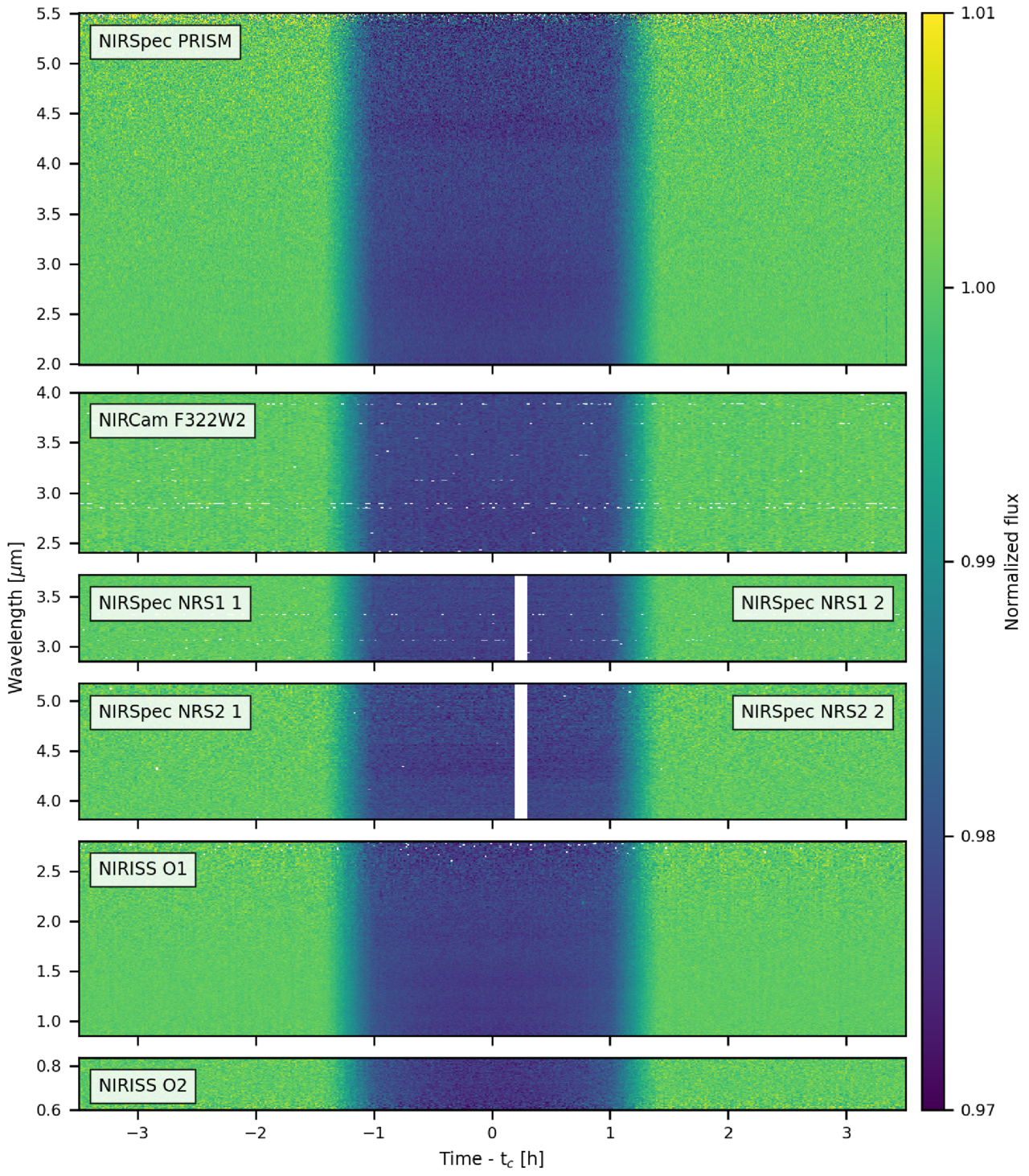 Spectrophotometric light curves used in the WASP-39 b joint analysis. White pixels indicate outliers that were masked from the analysis.