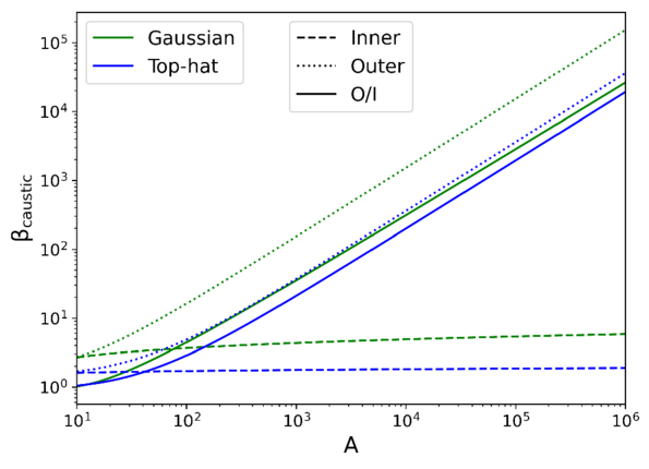The location of caustics βcaustic as a function of the lens amplitude A. For both the Gaussian and top-hat models, the dimensionless locations β of the outer caustics (dotted line) increase linearly with the lens amplitude A, whereas those of the inner caustics (dashed line) increase with A only very slightly, and thus they remain on the order of unity for a large range of A. As a consequence, the ratio between the outer and inner caustics (solid line) increases linearly with the lens amplitude A, suggesting a much greater range of the three-image zone for a lens with a greater amplitude. The point mass model is not shown because of its lack of outer caustic.