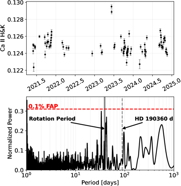 Top: time series of NEID Ca II H and K values. Bottom: Lomb–Scargle periodogram for the same dataset. The horizontal dashed line marks the 0.1% false alarm probability (FAP) level, computed using astropy’s Lomb–Scargle routine following the approach outlined in R. V. Baluev (2008). We identify no strong periods at or near the signal reported for HD 190360 d.