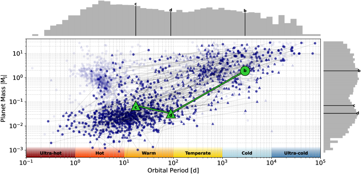 All exoplanets from the NASA Exoplanet Archive with known mass and orbital period. Triangle and circle point markers represent minimum and true masses, respectively. The larger green markers correspond to HD 190360’s three planets. All single-planet systems are made transparent, while all multiplanet systems are connected with a thin black line in order from shortest to longest period. Named period-bins are provided for reference according to rough temperature scales for planets orbiting main sequence FGK stars, and correspond to ﹩0\lt P\,\left[{\rm{d}}\right]\leqslant 1﹩ (ultrahot), ﹩1\lt P\,\left[{\rm{d}}\right]\leqslant 10﹩ (hot), ﹩10\lt P\,\left[{\rm{d}}\right]\leqslant 100﹩ (warm), ﹩100\lt P\,\left[{\rm{d}}\right]\leqslant 1000﹩ (temperate), ﹩1000\lt P\,\left[{\rm{d}}\right]\leqslant 1{0}^{4}﹩ (cold), and ﹩1{0}^{4}\lt P\,\left[{\rm{d}}\right]\leqslant 1{0}^{5}﹩ (ultracold). The gray histograms at the top and right correspond to the observed distributions of orbital periods and masses.
