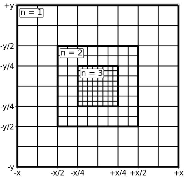 An example of a lower-resolution multigrid that can be employed for this study (Section 3.3). The multigrid has increased resolution toward the center, which is where the higher velocities of a protoplanetary disk are. The above example has three concentric 8 × 8 grids, whereas the one used for modeling has 15 concentric 192 × 192 grids.