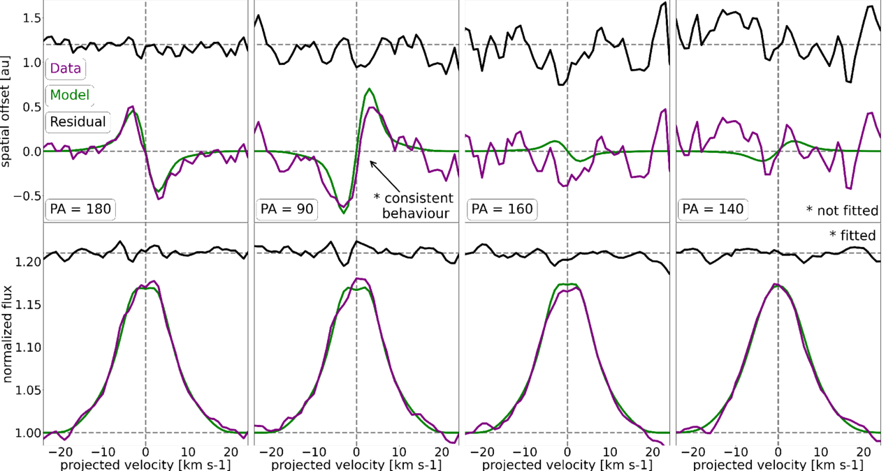 The high-J average transitions (purple) from Figure 4 with the best-fit results (green). The analysis of these line profiles (not spectroastrometric signals) are described in Section 3.3.1, where the protoplanetary disk’s radial extant, surface temperatures, and surface densities are constrained (Table 3).
