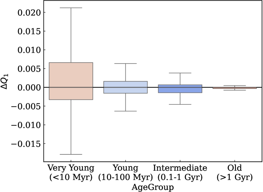 Impact of unresolved binaries on mass-segregation detection. The distribution centers on zero, demonstrating that binaries do not significantly alter our conclusions.