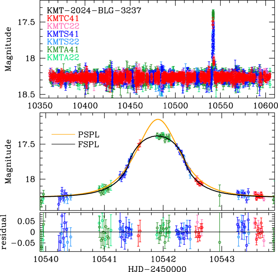 Light curve of KMT-2024-BLG-3237. The upper panel displays the full light curve from the 2024 season, while the lower panel provides the zoom-in of the event. The black and orange curves indicate the FSPL (fB = 0) and the PSPL model, respectively. The photometry is available in machine readable format as the data behind the figure.
