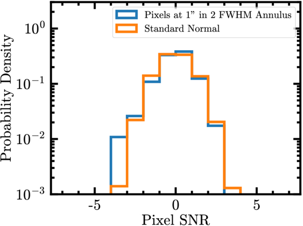 Distribution of S/Ns of pixels from the F444W PSF-subtracted image in a 2 FWHM width annulus centered at a separation of 1″ compared to a standard normal distribution.