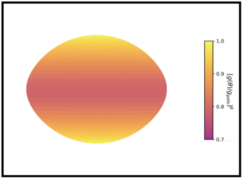 A figure illustrating the oblate shape of G2 with gravity darkening. The flattening (Req/Rpol) is ∼1.3, assuming that the mass is 0.7 M⊙, r sini = 3.1 R⊙, v sini = 130 km s−1, and i = 60°. The gravity-darkening exponent is β = 0.16, as derived by F. Espinosa Lara & M. Rieutord (2011). The mass and inclination are the most uncertain parameters. For these parameters, log gpole = 3.40 and log geq = 2.57. This can be compared to the (uncertain) measurement of g ∼ 3.6 (see Section 6.3).