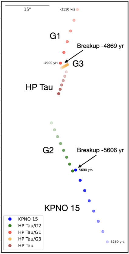 The motions of G1, G2, G3, KPNO 15, and HP Tau are shown in this figure in the time interval from 5600 to 3150 yr ago in steps of 350 yr. The nominal time of breakup for the G2/KPNO 15 pair is 5606 yr and 4869 yr for G1/G3. Note that the position and proper motion of G3 are affected by its close (31 mas) companion. The K4 star HP Tau is slowly crossing the stellar group and possibly disturbing it.