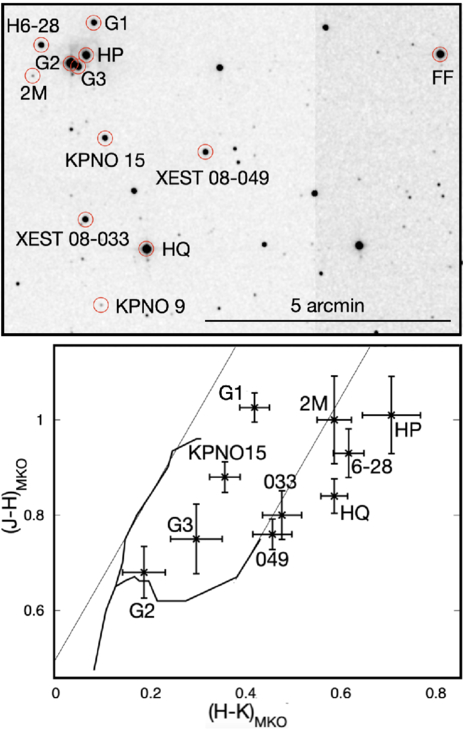Top panel: the YSOs within the Magakian 77 reflection nebula are identified in this Two Micron All Sky Survey (2MASS) K-band image, and their properties are listed in Table 1. H6-28 is Haro 6-28, and 2M is 2MASS J04355760+2253574. FF Tau is outside the field to the west. North is up, and east is left. Bottom panel: a J-H vs. H-K color–color diagram of 10 of the sources in the HP Tau multiple system. The dwarf and giant loci are from M. S. Bessell & J. M. Brett (1988), and the reddening lines are from G. H. Rieke & M. J. Lebofsky (1985). The abbreviations refer to the names in Table 1.
