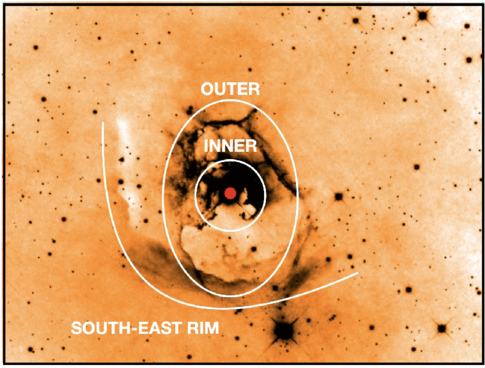 An optical image of the Magakian 77 reflection nebula with the three main rims identified. The red dot marks the position of G2. Image courtesy of Adam Block.