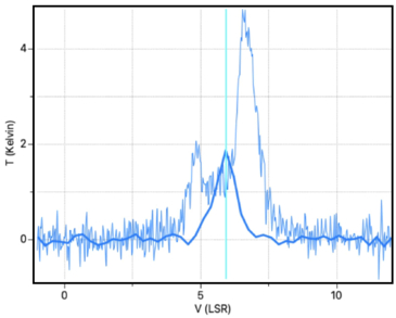 Profiles of 12CO and 13CO toward a circular area with radius 15﹩\mathop{.}\limits^{\unicode{x02033}}﹩5 and centered at the position 4:35:53.1 +22:54:38. The rest velocity of the cloud is VLSR = 5.93 km s−1.