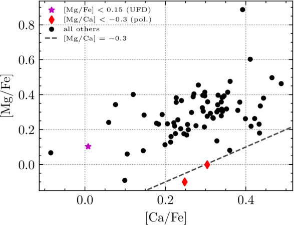Magnesium-to-iron ratio [Mg/Fe] against calcium-to-iron ratio [Ca/Fe]. Mg-poor stars are identified with colored points. The two red Mg-poor stars present [Mg/Ca] ≲ −0.3 and [Na/Fe] < 0, which is consistent with pollution of their star-forming ISM from SNe Ia (I. I. Ivans et al. 2003). The low occurrence of these signatures (2/75) is expected given how signatures of individual pollution events smear out at [Fe/H] ∼ −2 (T. T. Hansen et al. 2018). The magenta point marks a Mg-poor star that shows dynamical traces of being part of an accreted system and abundances consistent with a UFD (B. Letarte et al. 2010; A. Frebel et al. 2014; A. P. Ji et al. 2019; H. D. Andales et al. 2024).