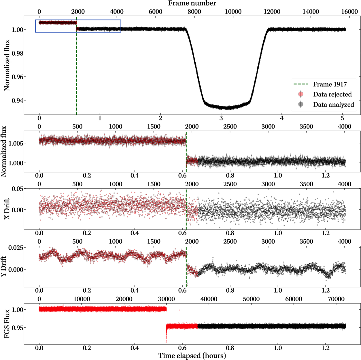 Top: the white light curve for observation 17 calculated with ExoTiC-JEDI; the box indicates the region highlighted in the next three subpanels. Bottom four panels: the photometry, shift in the centroid along the dispersion axis (X drift), shift in the centroid along the cross-dispersion axis (Y drift), and the counts in the fine guidance sensor (FGS flux). The discontinuity occurs simultaneously in the position of the trace and the photometry while the FGS flux shows a discontinuity 5 minutes earlier. The dashed vertical line marks integration frame 1917 (the start of the event). The red points indicate the data excised from subsequent analysis (the first 2070 frames), and the black data are the points analyzed in this work.
