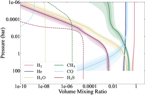 Volume mixing ratios for select molecules, assuming chemical equilibrium and a clear atmosphere, obtained from POSEIDON (solid lines) when fitting the coadded spectrum. The shaded regions indicate the ±1σ−2σ model posteriors. The dashed lines are the abundances for H2O, CH4, CO, and H2S from the best-fitting VULCAN model in Table 3. From the forward model, these molecules are expected with VMRs <10−4 in stark contrast to the POSEIDON values where some trace molecules are found with VMRs > 0.01.