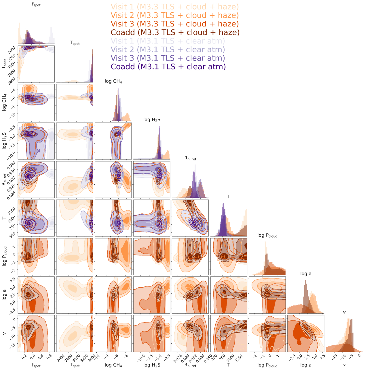 Similar to Figure 4 except comparing M3.3 with clouds and hazes to M3.1 with no clouds. Significant correlations are seen across the parameter space in the visit-to-visit variability, particularly for the hazy retrievals.