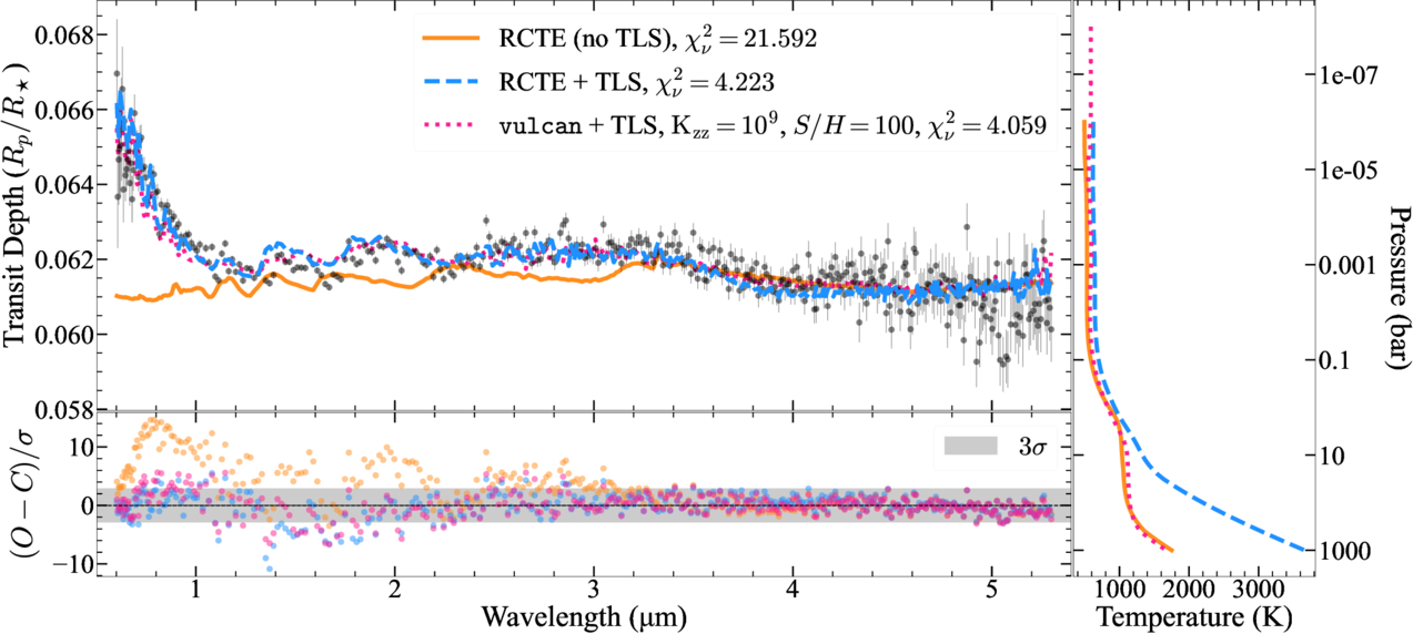 Top left: coadded TOI-5205b ExoTiC-JEDI transmission spectrum along with the best-fitting grid-based models assuming equilibrium chemistry (orange line, obtained from PICASO), equilibrium chemistry with TLS (blue-dotted line), or disequilibrium chemistry with TLS (pink-dotted line, obtained from VULCAN). Models with TLS cannot fully replicate the slope at the blue end of the spectrum. Bottom left: the difference between the data and model, scaled by the errors of the data. The ±3σ region is shaded for reference. Right: the pressure–temperature profile for each grid shown in the top left panel.