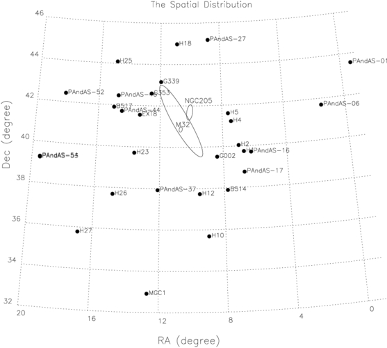The spatial distribution of our M31 halo star cluster sample (black dots). The dashed ellipses represent the D25 isophotes of M31, M32, and NGC 205.