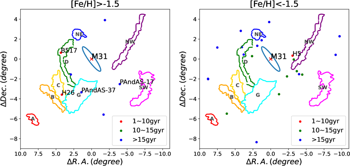 Spatial distribution of 29 sample clusters overlaid on the M31 stellar substructure map from A. D. Mackey et al. (2010; their Figure 3). Substructures are labeled as follows: Streams A—D; Giant Stream (G); NE structure (NE); NW Stream (NW); and SW Cloud (SW). The panels divide the sample by metallicity: metal-rich ([Fe/H] > −1.5, left) and metal-poor ([Fe/H] = −1.5, right). Symbol colors indicate age: red (<10 Gyr), green (10–15 Gyr), and blue (>15 Gyr). Labeled clusters are discussed in detail in the text.