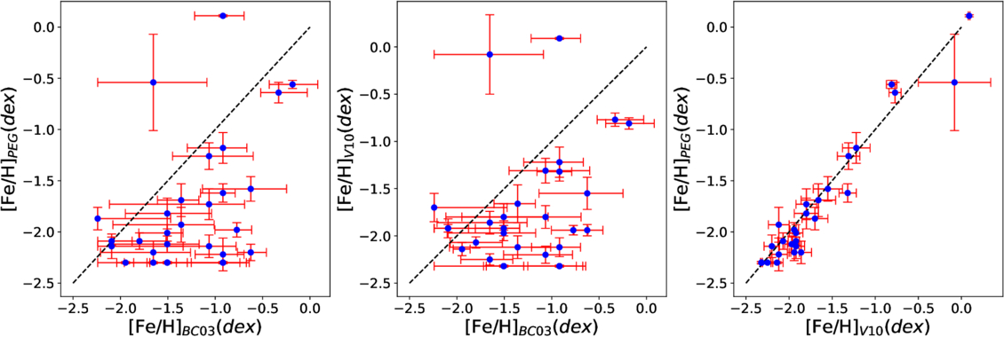 Comparison of metallicities derived from different models. The x-axis shows results from the BC03 method, while the y-axis displays results from ULYSS using either the Vazdekis (V10) or PEGASE-HR (PEG) models. The dashed line indicates a 1:1 relation. Error bars represent the 1σ uncertainties from each method.