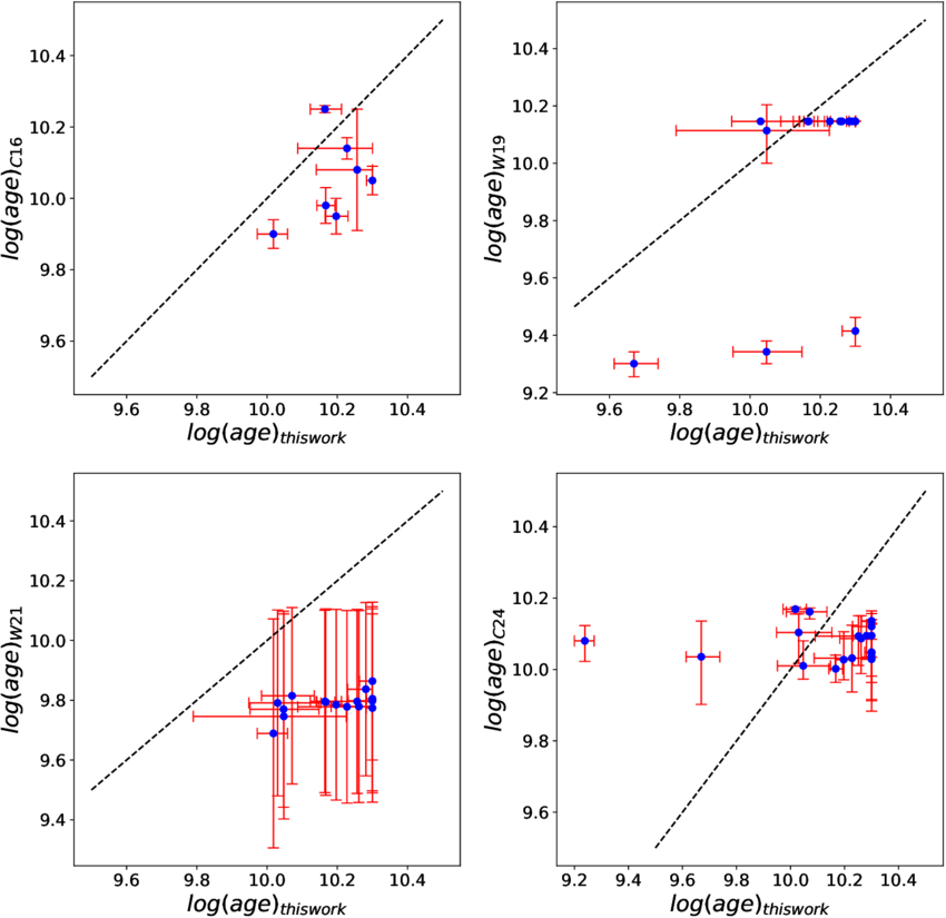 Same as Figure 7 but comparing our derived ages with literature values.