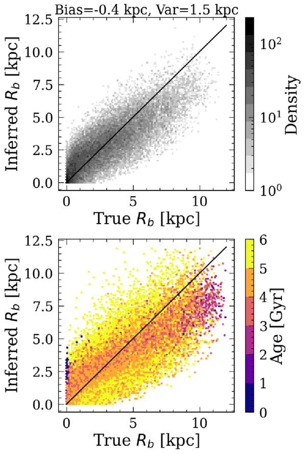 Histogram of the true birth radii from the simulated LMC versus the inferred birth radii using the method described in Section 2.3, colored by the number of stars (top) and the median age (bottom). We are able to successfully infer birth radii with a bias of −0.6 kpc and a RMSE of 1.5 kpc for stars <6 Gyr.