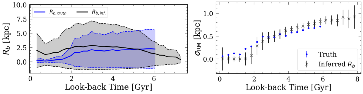 Left: the median and the 1.5∗MAD of the birth radii distribution as a function of age using the true Rb (Rb,truth) and age shown in blue, and the inferred Rb (Rb,inf.) and true age convolved with a 20% uncertainty in black. Right: the true migration strength (blue points) compared to the migration strength measured using inferred Rb (black crosses with error bars) for the simulation. The uncertainty in the inferred Rb of 1.5 kpc (see Figure 2) is accounted for by subtracting it in quadrature from the total scatter. When the total scatter is <1.5 kpc, we set the radial migration strength to be 0, as the quantity inside the square root becomes negative and therefore nonphysical. The uncertainties are measured with bootstrapping Rb with a width of 1.5 kpc and age with a width of 20% of its value. Both relations using inferred Rb extend beyond 6 Gyr due to the imposed age uncertainty. We are able to reproduce the general shape for both the Rb distributions and the radial migration strength.