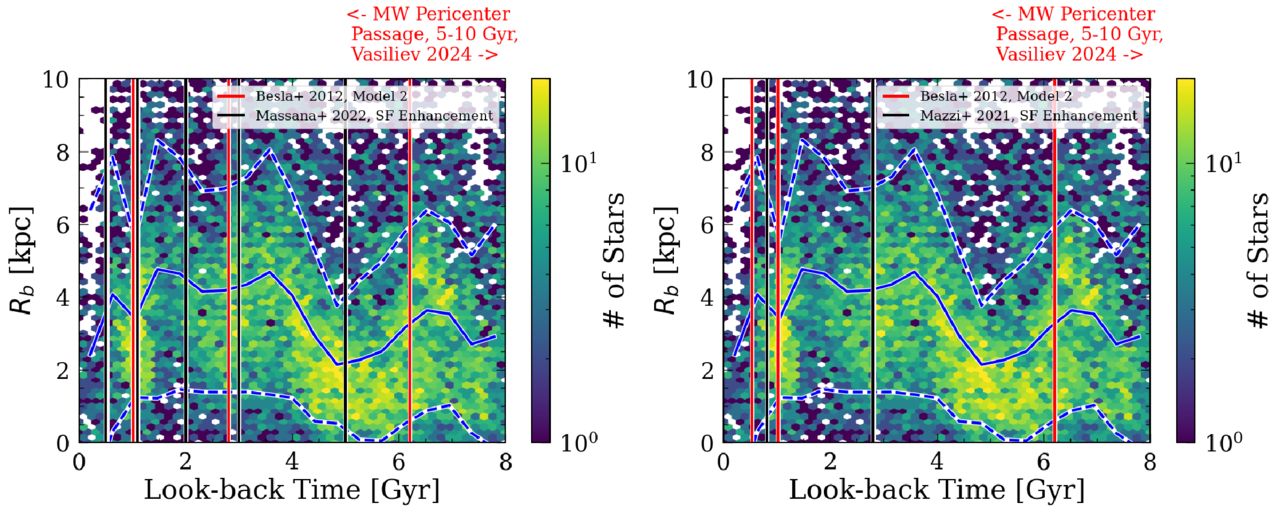 The detailed SFH of the LMC compared with SF enhancements from P. Massana et al. (2022) and A. Mazzi et al. (2021). The blue solid line shows the median star-forming Rb, and the dashed lines show 1.5∗MAD. The black lines are the center of the SF episodes identified from the literature as indicated in the legends, the SMC pericenter passage times are taken from model 2 predictions in G. Besla et al. (2012), and the possible first passage time with the MW 5–10 Gyr ago is shown on the top (E. Vasiliev 2024). The steepening in the metallicity gradient and the increase in SF around 1.1, 3, and perhaps 5 Gyr match our expectations for an infalling satellite with varying disk alignments. In this case, it is likely the SMC or the LMC passage with the MW. The location of the starbursts suggests aligned disk spin orientations between the merging galaxies during the 5 and 1.1 Gyr passages and misaligned or perpendicular disk spin orientations for the 3 Gyr passage based on results from simulation analysis (J. Moreno et al. 2015). The enhancements at 0.5 and 2 Gyr taken from P. Massana et al. (2022) have no significant signatures in our Rb distribution. It is also interesting to point out that the SF happens at the outer disk for the three pericenter predictions, suggesting the alignments between the LMC and SMC disks do not change if the predictions from the model are correct.