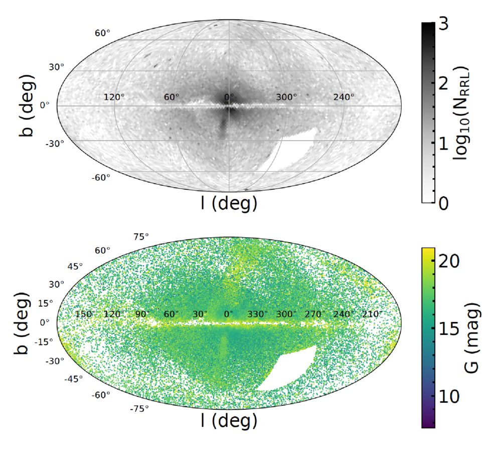 The sky distribution in Galactic coordinates (l, b) of our RRL sample. The top panel shows the log density for the 105,325 RRL we use in this work, after removing the LMC and SMC with a cut in R.A. and decl. The bottom panel shows the sky distribution of our final sample colored by the Gaia G magnitude, which, because of their standard-candle nature, is strongly correlated with the distance.