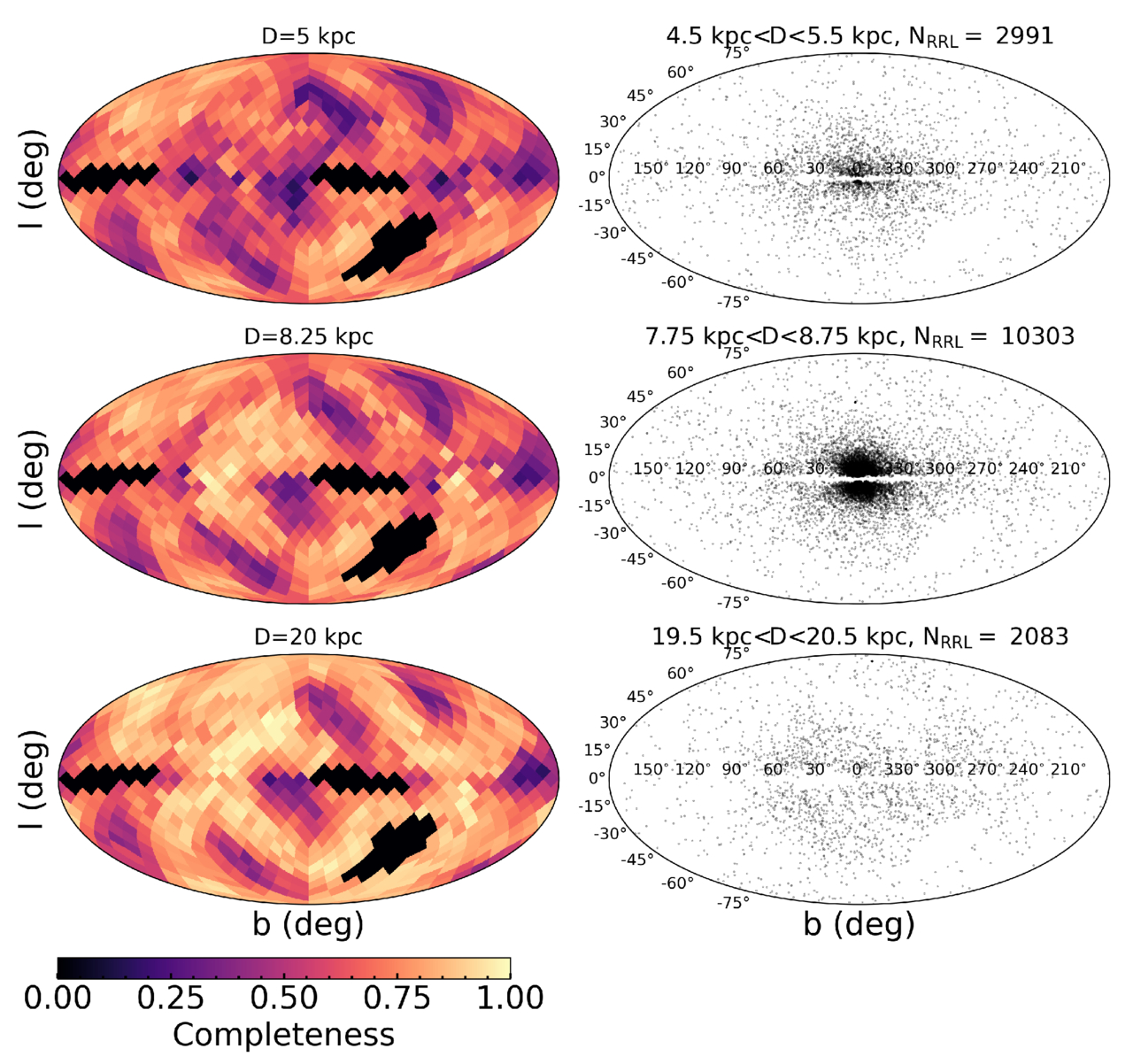Empirical Completeness Maps of the RRL sample in Galactic Coordinates at heliocentric distances of 5 kpc (top left), 10 kpc (middle left), and 20 kpc (bottom left). We show corresponding slices of the data in heliocentric distance bins of 1 kpc in the right panels. At small distances, the completeness is degraded because of the bright limits of surveys. The dominant structure in the completeness map is consistent with the Gaia scanning law.