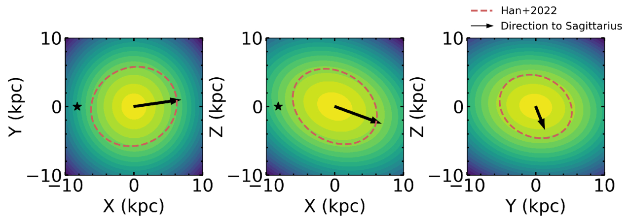 The inferred Galactic distribution of RRL as a GMM. The face-on distribution evaluated at Z = 0 kpc is shown in the left panel. The middle and right panels show the edge-on distributions evaluated at X = 0 kpc and Y = 0 kpc, respectively. The location of the Sun is shown as a black star in the left and middle panels. In all panels, we include an ellipse (red-dashed line) which demonstrates the shape and tilt of the halo model from J. J. Han et al. (2022). We also show the direction to Sagittarius which is located at (17.9, 2.6, −6.6) kpc (E. Vasiliev et al. 2021).