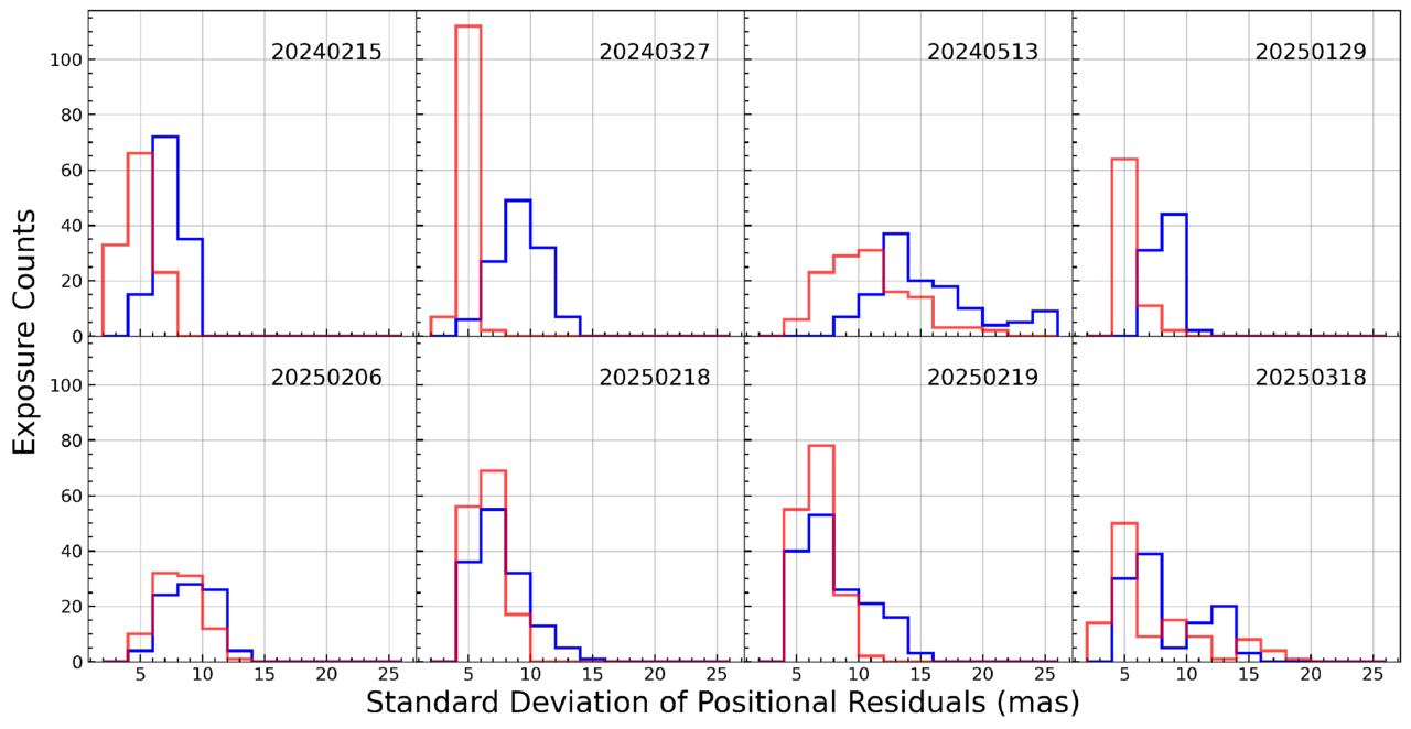 Histograms of the standard deviations of GD-corrected residuals for all exposures within a single night. The blue bars represent the standard deviations along the X-axis, while the red bars represent those along the Y-axis.