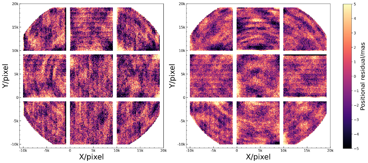 Stacked maps of positional residuals for each CCD after GD modeling. The left panel shows the mean residual in the X-direction, while the right panel shows the mean residual in the Y-direction. Each pixel represents the mean positional residual averaged within a 100 × 100 pixel bin in the local CCD coordinate system.