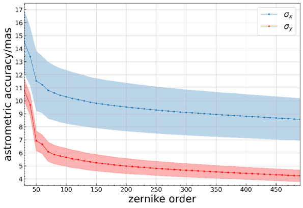 Variation of astrometric accuracy for all exposures in the 20240327 dataset after correction with Zernike polynomials of different orders. The solid lines indicate the mean astrometric accuracy across all exposures for each order, while the shaded regions represent the 1σ scatter among these exposures.