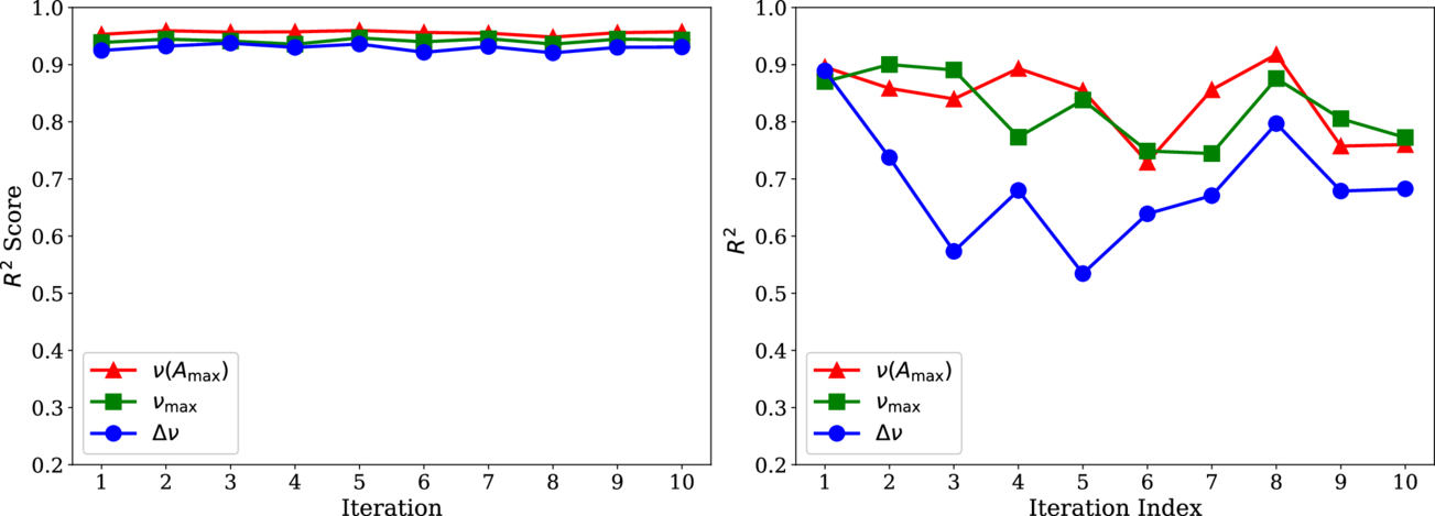 The R2 score for predicted ﹩\nu ({A}_{{\rm{\max }}})﹩ (red triangle), ﹩{\nu }_{{\rm{\max }}}﹩ (green square), and Δν (blue circle) for test (left panel) and generalization (right panel) samples across 10 iterations of random selection. The results are based on 583 and 60 stars from a total of 643 δ Sct stars.