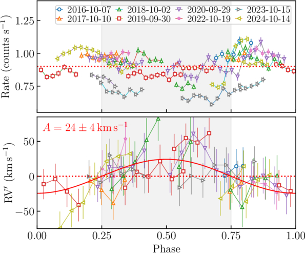 Phase-folded rates and ﹩{\rm{RV}}^{\prime} ﹩s of the “background”. The ﹩{\rm{RV}}^{\prime} ﹩s are fitted by a sine curve (red line) with the amplitude A, using SCIPY.OPTIMIZE.CURVE_FIT.