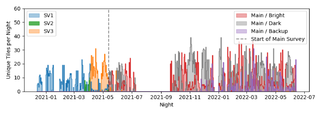 Number of unique SV and main-survey tiles in DR1 as a function of the night (see Table 4). Note that tiles can be observed on multiple nights and that the vertical dashed line indicates the start of the main survey on 2021 May 14. The large gap in observations between 2021 July 10 and 2021 September 20 was due to a major upgrade of the focal-plane electronics.