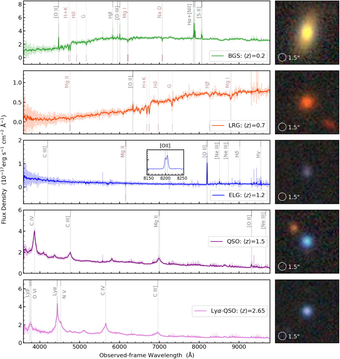 Composite spectra and example LS images of the extragalactic target classes. The left-hand panel of each row shows the average of 75–100 spectra in a narrow redshift slice around the mean redshift value labeled in the lower-right of each panel. For the BGS, LRG, and ELG target classes, we use a bin width of Δz/(1 + z) = 10−5, and for the QSO and Lyα QSO target classes, we use Δz/(1 + z) = 3 × 10−5. The faint colored lines represent the inverse-variance-weighted average spectra, while the darker lines are the same spectra smoothed with a five-pixel Gaussian kernel. The vertical dotted lines indicate the expected wavelengths of key emission and absorption lines, and for the ELG class, the inset shows the resolved [O II] λλ3726, 29 doublet. The right-hand panel of each row features a g, r, z color image of one representative object from each target class, with the fiber diameter of 1﹩\mathop{.}\limits^{\unicode{x02033}}﹩5 drawn to scale.