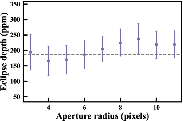 Eclipse depth of GJ 3473 b as a function of aperture size. The dashed horizontal line indicates the eclipse depth for an aperture radius of 6 pixels, which is the standard size used in our analysis.