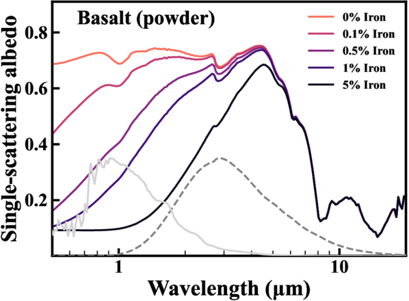 Single-scattering albedo of Basalt powder at varying degrees of space weathering via the formation of nanophase metallic iron particles. No added space weathering is represented by 0% iron. The spectra of the stellar irradiation and planetary flux, with 0.5% iron, are represented by solid light gray and dashed gray lines, respectively; however, these are not to scale for clarity.