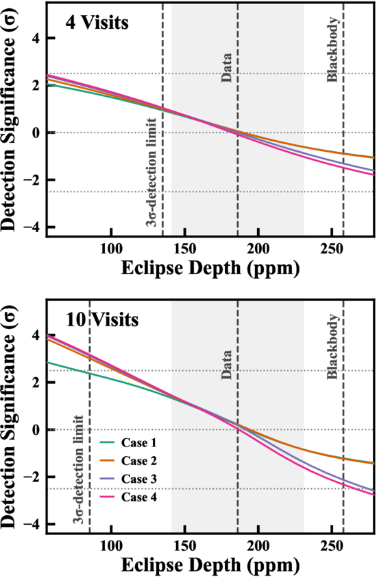 Detection significance of an atmosphere on GJ 3473 b as a function of the eclipse depth in the MIRI F1500W bandpass, with 4 (top) and 10 (bottom) visits. Positive values correspond to the detection significance of an atmosphere, while negative values correspond to the detection significance of a bare rock. At a significance of zero, these two scenarios are equally likely. The four cases are described in Section 4.2, representing different prior considerations. The vertical dashed lines denote the required eclipse depth for a 3σ detection of the eclipse itself, the actual measured eclipse depth, and the eclipse depth of a blackbody, respectively. The light-gray region represents the uncertainty of the present measurement. The horizontal dotted lines show the detection significances at 0 and ±2.5σ.