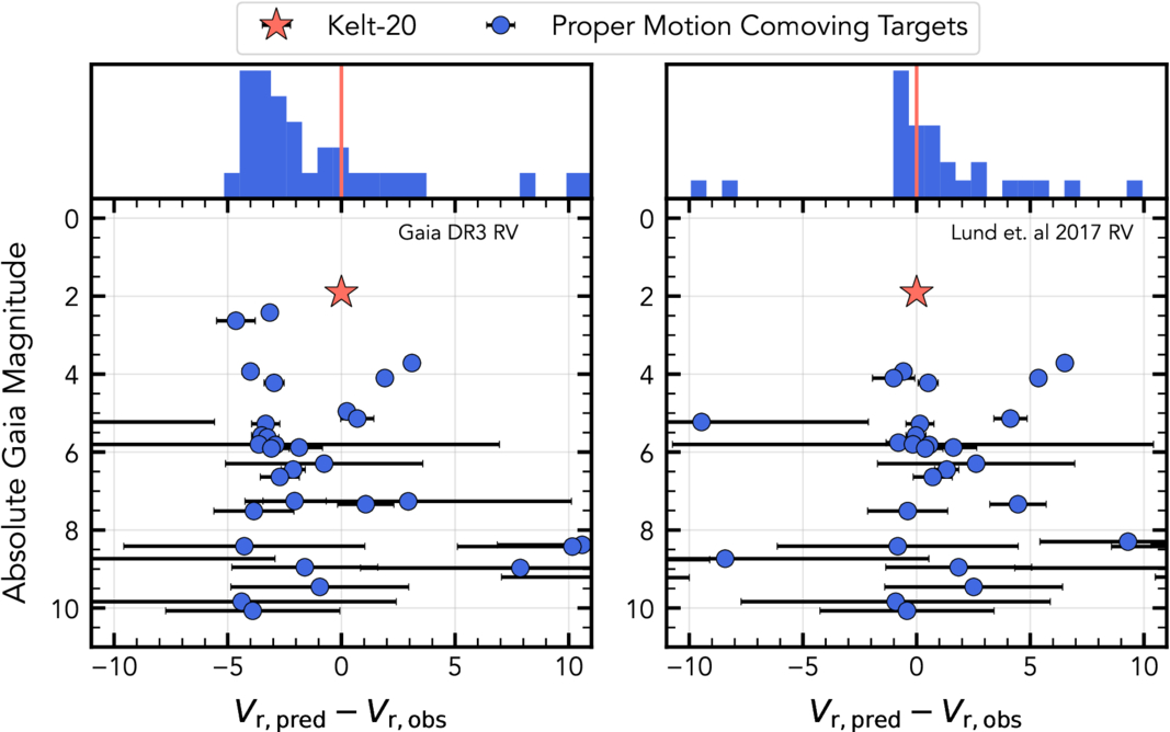 Comparison of FriendFinder results obtained using the Gaia DR3 RV (left) and the M. B. Lund et al. (2017) RV (right) for KELT-20. Plotted are the differences between predicted (Vr,pred) and observed (Vr,obs) RVs as a function of the absolute Gaia magnitude. Blue circles mark stars with RUWE <1.25. The M. B. Lund et al. (2017) RV yields a closer alignment with the overdensity, supporting its adoption in this analysis.