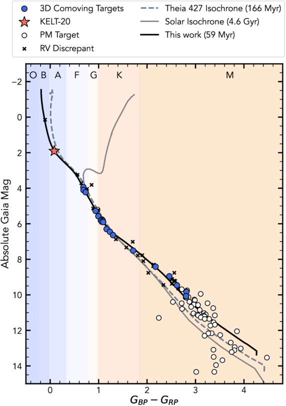 CMD of comoving targets to KELT-20. 3D comoving stars are shown as blue circles, while non-3D PM targets are shown as white circles. KELT-20 (coral star) is highlighted, along with a solid line showing the best-fit PARSEC isochrone derived from the isochronal analysis, corresponding to the association’s median age. The dashed line shows a solar-age, solar-metallicity isochrone for comparison. Targets whose RVs differed by more than 3 km s−1 and thus not included in our analysis are shown as an “x.” Shaded background panels denote spectral type color regions based on J.-V. Harre & R. Heller (2021).