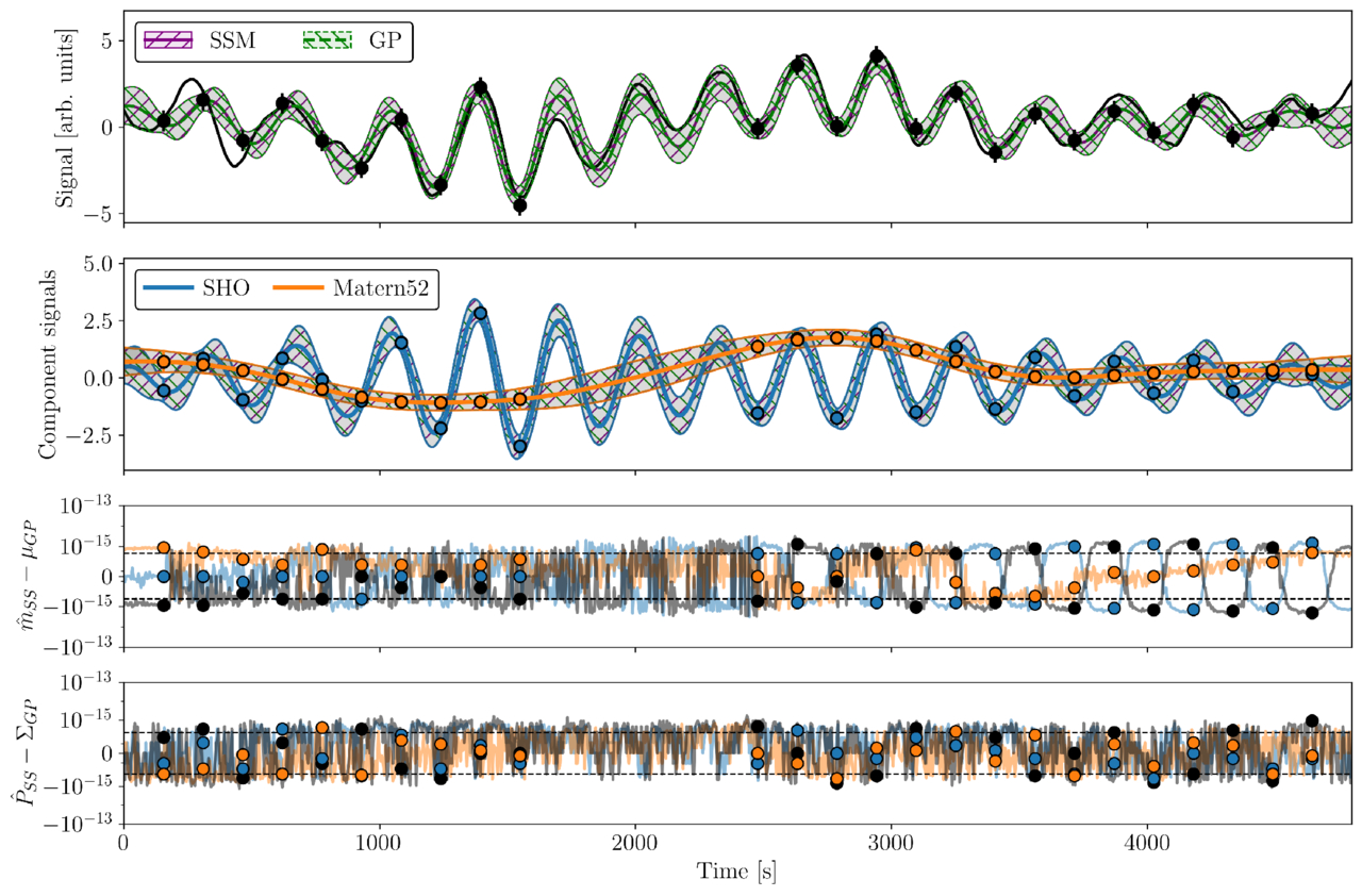 Equivalence of linear Gaussian SSMs to GPs. Top: The true signal (in black) is the sum of an SHO and Matérn-5/2 kernel. Synthetic measurements (black points) are noisy samples of this process. The purple “/” band shows the predicted mean and 1σ variance given the data from the SSM method; the green “\” band shows the same for the full GP method. Middle: The same as the top panel but decomposed into each component kernel’s prediction at the test points (filled bands) and at the data (points). Bottom: The bottom two panels show the residuals for the predicted mean and variance from the overall model prediction (black line) and component predictions (blue/orange lines) at the test points, and well as at the data (points), between the SSM method and the full GP method. The horizontal dashed lines denote machine precision for 64 bit floating-point numbers in the dynamic range of the data; In all cases, the difference between smolgp and tinygp is within this level.